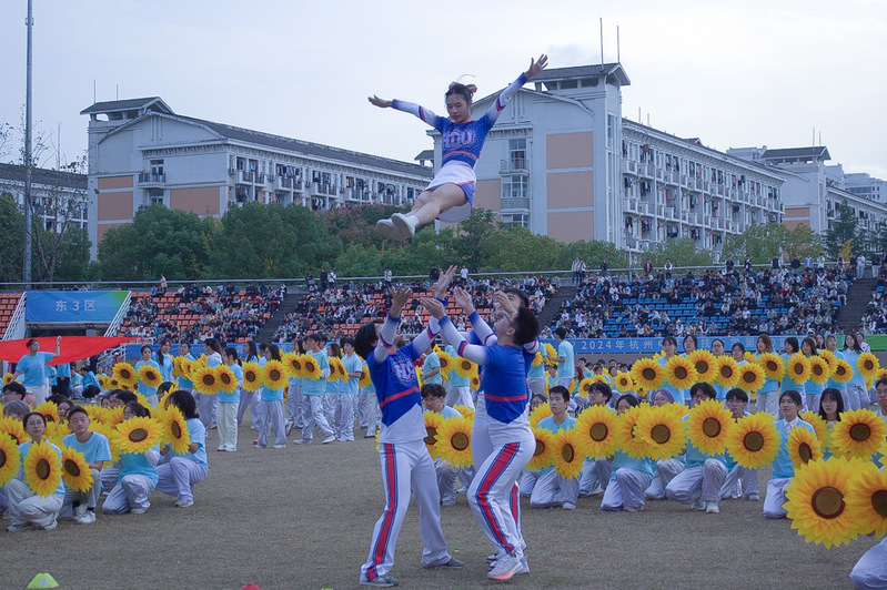 运动会开幕式在“师韵锦动映风华”的八段锦表演中拉开帷幕,400多名教职工,动作整齐划一,气势恢宏,带来了一场视觉盛宴。紧接着,来自各学院的800多名学生分为三个篇章——“迎风破浪·奋进杭电”、“青春舞动·魅力杭电”、“亚运同在·共进杭电”,奉献了精彩绝伦的文艺表演。这些表演不仅深切表达了杭电学子对祖国的深厚情感,更展现了他们朝气蓬勃、团结奋进的精神风貌。